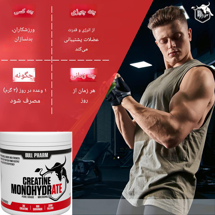 یکی از محبوبترین و پرمطالعهترین مکملهای ورزشی در جهان است. این ترکیب بهطور طبیعی در بدن از سه اسید آمینه آرژینین، گلیسین و متیونین تولید میشود و نقش کلیدی در تأمین انرژی سریع برای فعالیتهای بدنی دارد پودر کراتین مونوهیدرات میکرونیزه شده با خلوص بالا برای پشتیبانی از تولید انرژی، توده بدنی بدون چربی، استقامت عضلانی و توان خروجی است. بدون افزودنی . بدون طعم دهنده و رنگ مصنوعی میباشد . هر بطری کراتین مونوهیدرات بول فارم حاوی ۱۰۰ وعده (بطریهای ۳۰۰ گرمی) است. دستورالعمل استفاده: یک وعده ۳ گرمی کراتین مونوهیدرات میکرونیزه، مخلوط در آب یا نوشیدنی سرد، یک بار در روز.